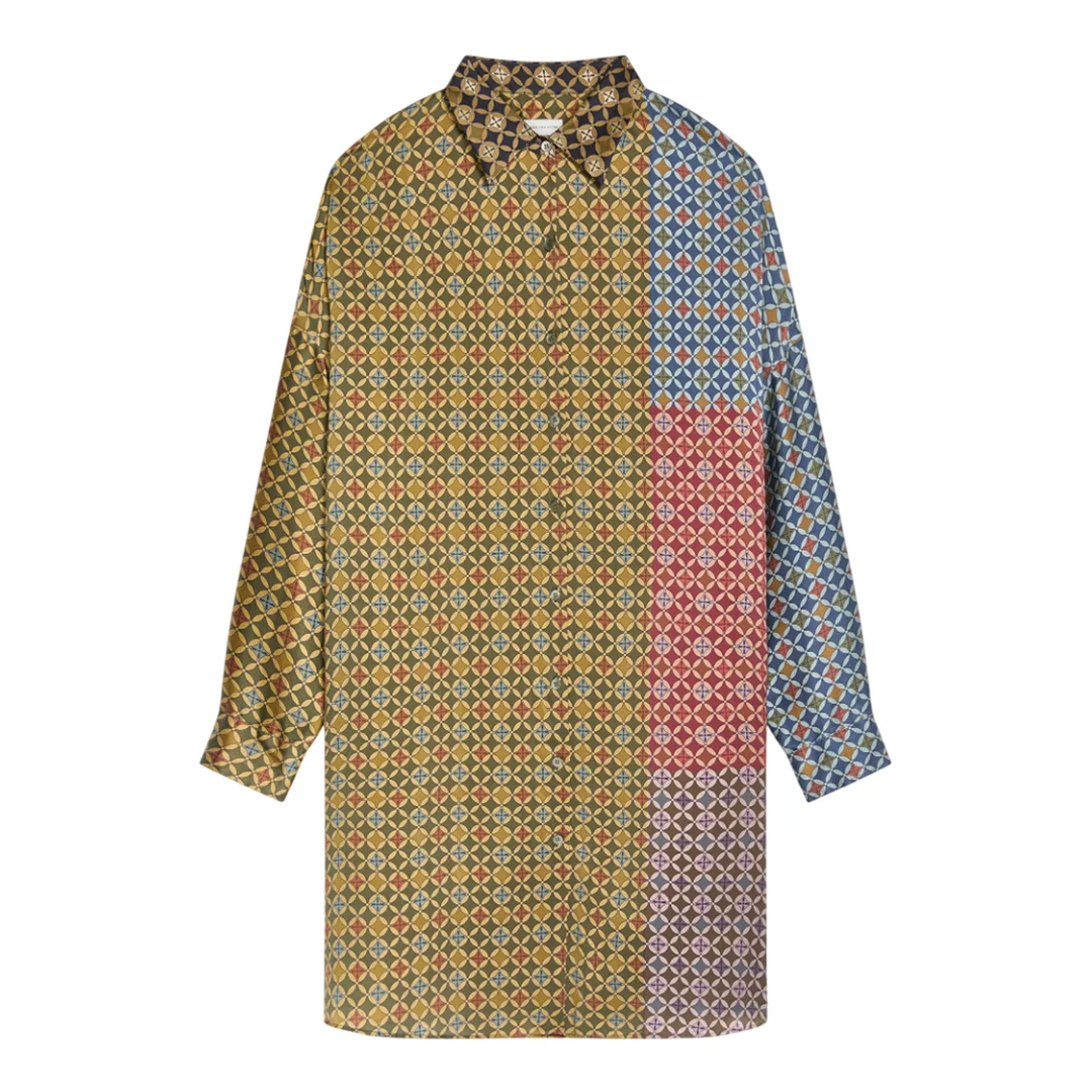 300050354GRN-XS / A5252-011001-2330/2330/975 - Premium silk construction - Geometric diamond pattern print - Color-blocked design with earth tones, blues, and coral - Classic collar with button-front closure - Long sleeves with button cuffs - Relaxed shirt dress silhouette - Midi length - Unlined for fluid drape The Dries Van Noten Dasia Dress delivers Belgian artistry through bold geometric patterning and luxurious silk construction. Crafted from premium silk with an intricate diamond motif in rich earth tones, blues, and coral hues that create striking color-blocking effects. The relaxed shirt dress silhouette features the brand's signature maximalist aesthetic with sophisticated drape and movement.