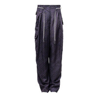 600071959PUR036 / POLK/2113/401 - High-waisted design with button closure - Adjustable waistband with fabric ties - Multiple cargo pockets on sides - Diagonal stripe pattern throughout - Wide leg silhouette - Premium cotton twill construction - Relaxed oversized fit Dries Van Noten Loose Fit Workwear Trousers deliver contemporary utilitarian style with Belgian craftsmanship and architectural silhouette. Crafted from premium cotton twill with diagonal stripe pattern in navy and purple, featuring cargo pockets and relaxed proportions. The structured workwear design and signature Van Noten aesthetic create a bold statement for modern wardrobes.