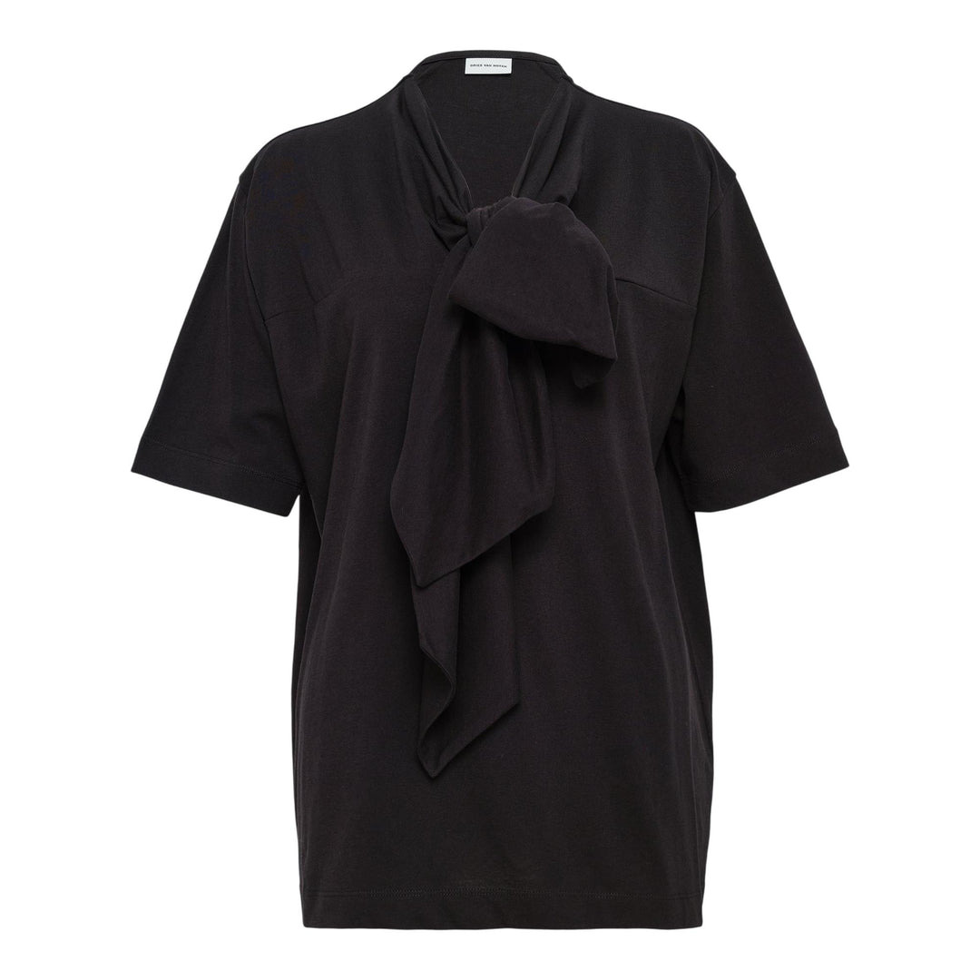 600071672BLK0XS / HEBITTA/2600/900 - Detachable bow-tie knot at neckline - Short sleeves - Regular relaxed fit - Premium cotton jersey construction - Round neckline with draped detail - Architectural silhouette Dries Van Noten Regular Fit T-Shirt delivers contemporary elegance with distinctive knot detailing at the neckline. Crafted from premium black cotton jersey with relaxed short sleeves and architectural draping that creates visual interest. The signature bow-tie accent transforms this essential piece into a statement of sophisticated Belgian design.