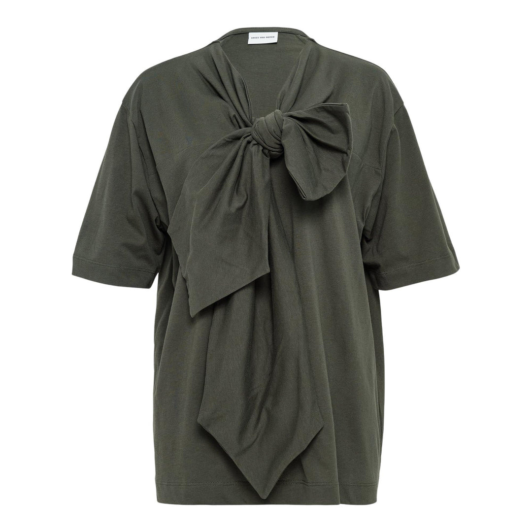 600071672DGN00S / HEBITTA/2600/613 - Asymmetrical knotted front detail - Regular fit through body - Short sleeves - Premium cotton jersey construction - V-neckline with tie closure - Draped asymmetrical hemline The Dries Van Noten Regular Fit T-Shirt With Knot delivers contemporary elegance with distinctive draping details and relaxed sophistication. Crafted from premium cotton jersey in rich olive green, featuring an asymmetrical knotted front design that creates visual interest and flattering silhouette. The signature Belgian craftsmanship and avant-garde styling showcase the brand's innovative approach to everyday luxury.