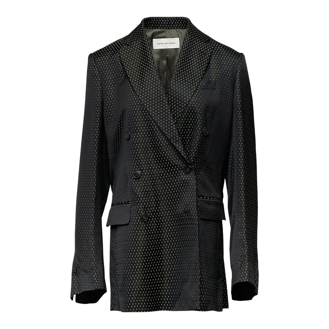 600071649BLK038 / BAFYA/2350/900 - Double-breasted button closure - Peak lapels - Structured shoulders - Fitted waist silhouette - Welt pockets with contrasting trim - Full lining - Micro-dot pattern fabric - Premium wool blend construction The Dries Van Noten Waisted Double Breasted Blazer delivers sophisticated tailoring with contemporary Belgian craftsmanship. Constructed from premium wool blend fabric in a distinctive micro-dot pattern, featuring structured shoulders and precise waist definition. The double-breasted silhouette and signature Dries Van Noten aesthetic create an elevated statement piece for modern wardrobes.