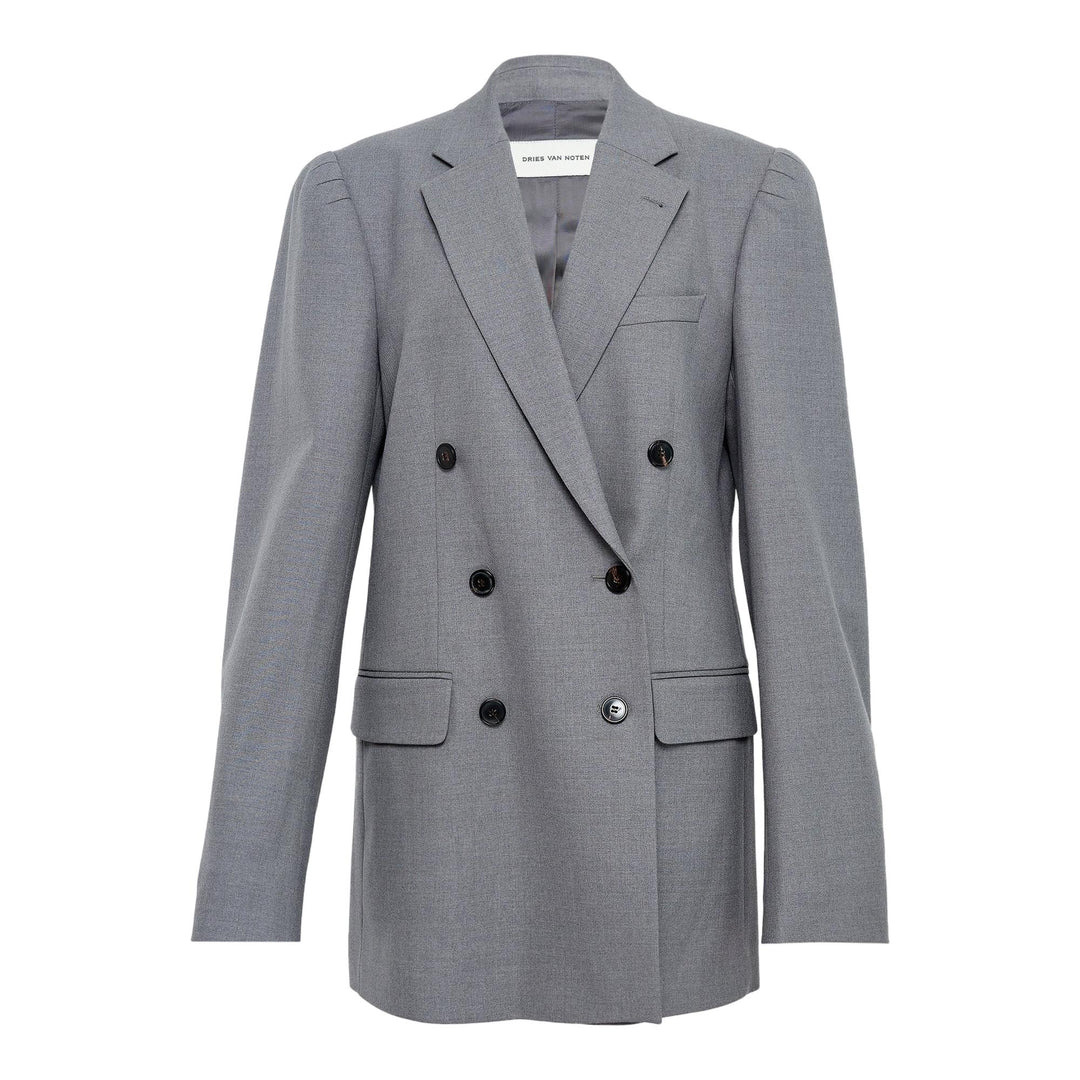600071648GRY036 / BAFY/2061/802 - Double-breasted closure with six buttons - Notched lapels with clean lines - Structured shoulders with subtle padding - Fitted waist with tailored seaming - Two front flap pockets - Single chest pocket - Full lining - Premium wool-blend construction Dries Van Noten Waisted Double Breasted Blazer delivers contemporary tailoring with refined Belgian craftsmanship. Constructed from premium wool-blend suiting in sophisticated gray, featuring structured shoulders and precise waist definition for a flattering silhouette. The designer's signature approach to proportions creates an elevated wardrobe essential that balances classic menswear codes with modern sophistication.