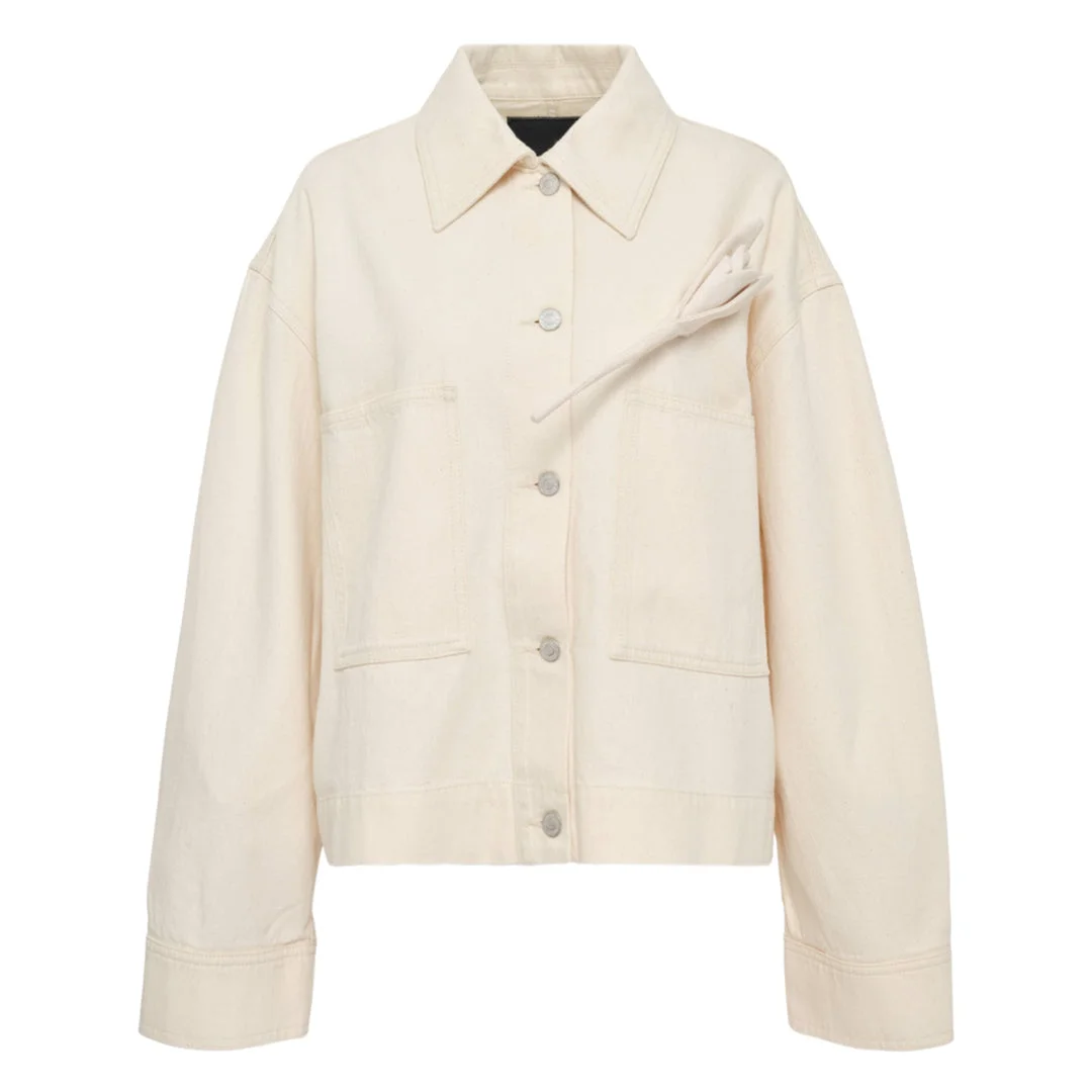 600077690BGE006 / PS26_DEJ5_60079012/00/ECRU - Classic pointed collar - Front button closure - Long sleeves with button cuffs - Chest and waist pockets - Cream denim construction - Relaxed fit - Premium button hardware The Erdem Denim Jacket delivers contemporary elegance with structured tailoring and premium construction. Crafted from soft cream-colored denim with a relaxed fit, featuring classic collar styling and refined button closure. The minimalist silhouette and luxury finishing elevate casual dressing with sophisticated design.