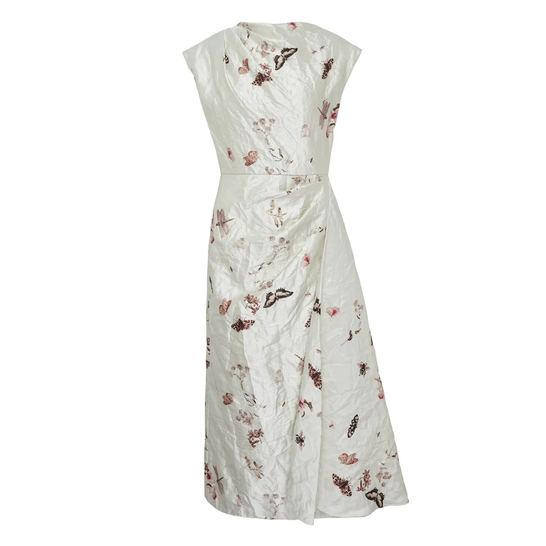 600077686BGE008 / PS26_D100P_51159002/00/CABINET - Wrap-style construction with tie waist - Short cap sleeves - Asymmetric draped hemline - Botanical floral print - Lightweight silk fabric - V-neckline - Midi length Erdem Short Sleeve Draped Dress delivers romantic femininity with sophisticated draping and botanical elegance. Crafted from lightweight silk with delicate floral print in soft ivory tones, featuring the brand's signature English garden aesthetic. The asymmetric wrap construction and fluid draping create an effortlessly graceful silhouette perfect for special occasions.