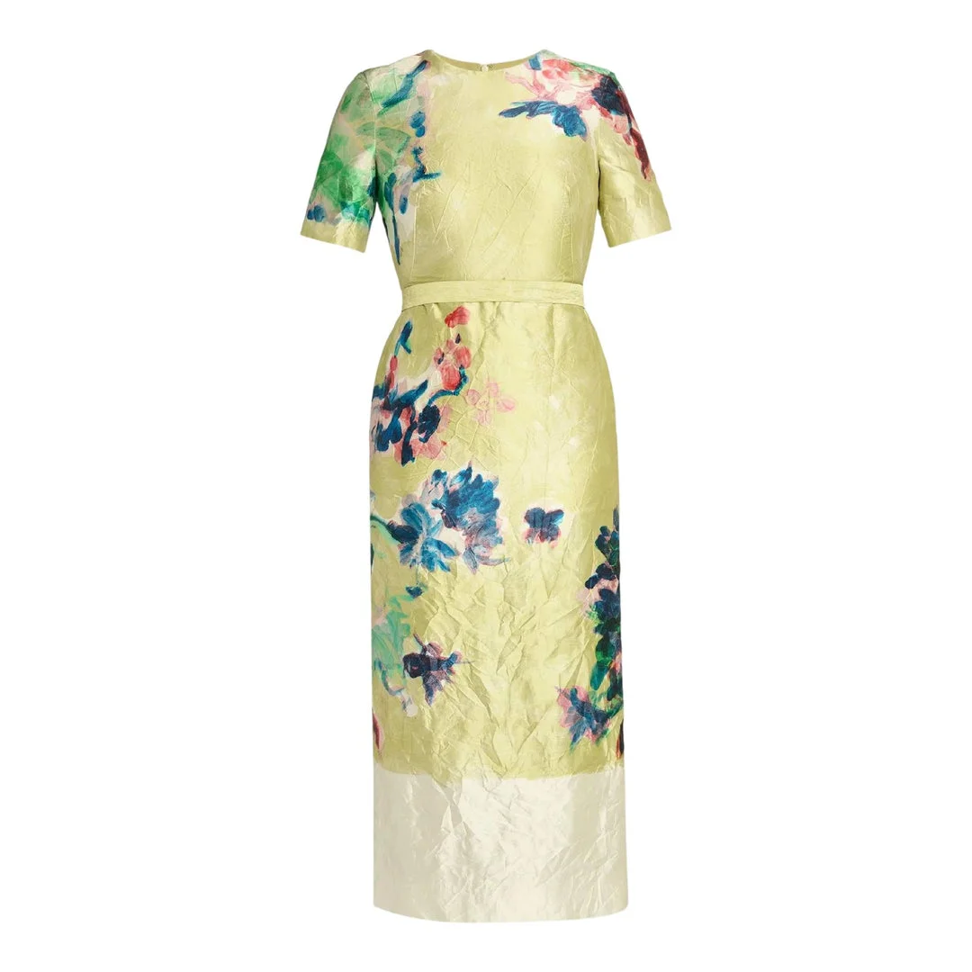 600072666YEL008 / PF25_D27_50097001/00/ARTIST GA - Round neckline - Short sleeves - Fitted bodice with tie waist belt - Midi-length hem - Textured jacquard fabric construction - All-over floral print - Concealed back zip closure - Tailored fit Erdem Short Sleeve Midi Dress delivers sophisticated femininity with botanical-inspired luxury tailoring. Crafted from premium textured jacquard in soft yellow base with vibrant floral motifs in blues, greens, and coral tones throughout. The fitted bodice with tie waist and midi-length silhouette creates an elegant statement piece for special occasions.