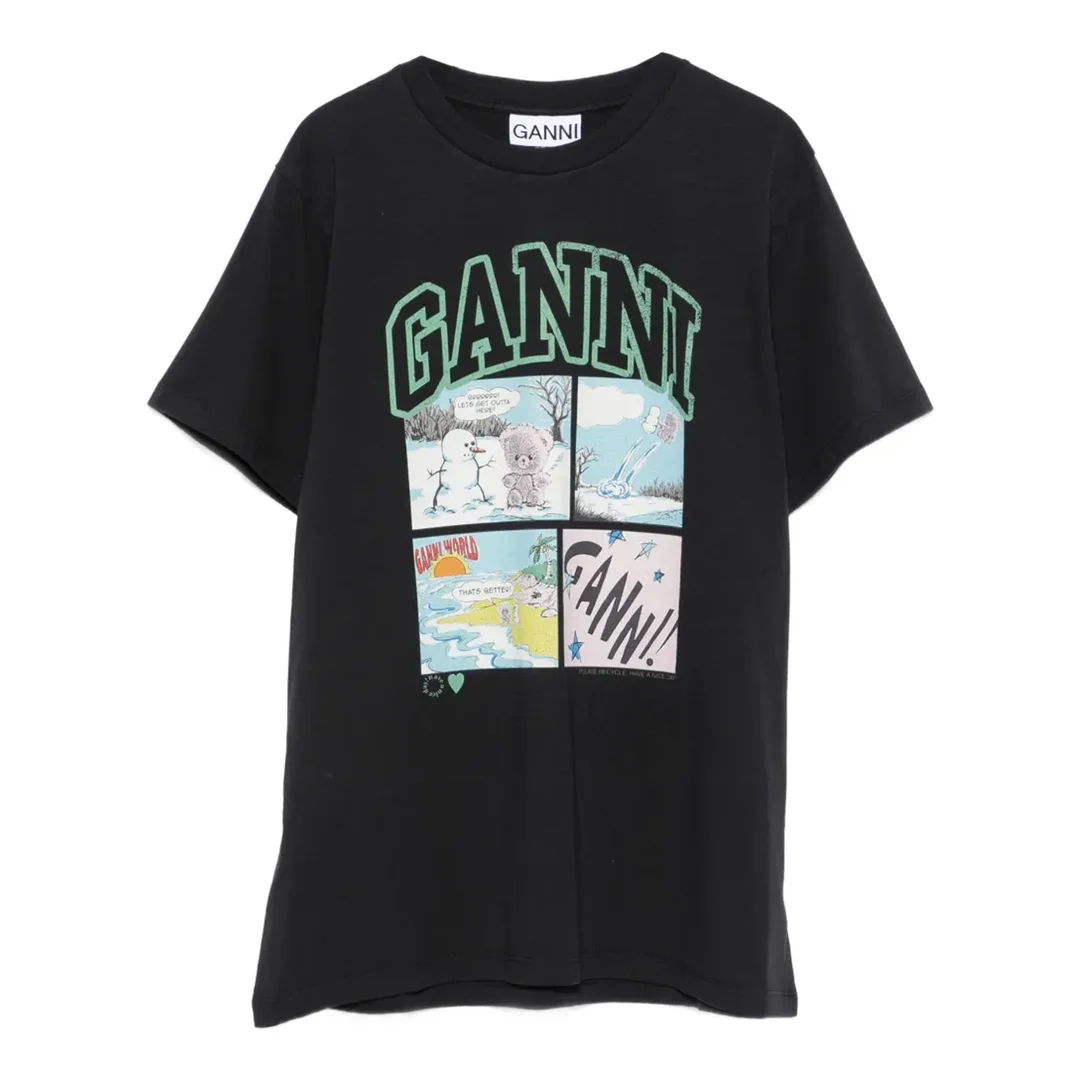 300051441BLK-XS / E6A1050070/00/252 - Cotton jersey construction - Comic panel bear graphic print - GANNI collegiate lettering - Crew neckline - Short sleeves - Relaxed oversized fit - Ribbed collar trim The GANNI Basic Cotton Jersey Bear Comic T-Shirt delivers playful Danish design with contemporary streetwear appeal. Crafted from soft cotton jersey in classic black, featuring an oversized comic panel graphic with whimsical bear illustrations. The relaxed silhouette and signature GANNI collegiate lettering create a statement piece that blends comfort with Scandinavian cool.