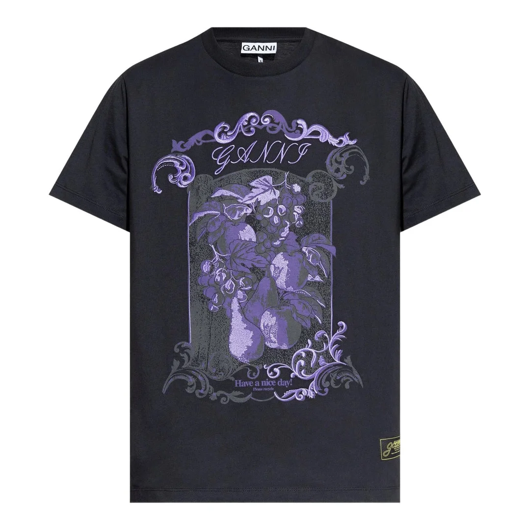 600070846GRYXXS / T4240/00/252 - 100% cotton jersey construction - Vintage damask fruit graphic print - Crew neckline - Short sleeves - Relaxed fit silhouette - Ribbed neck trim - GANNI signature label GANNI Basic Cotton Jersey Damask T-Shirt delivers contemporary Scandinavian style with vintage-inspired graphic artwork. Crafted from premium cotton jersey in deep navy, featuring an ornate purple damask fruit print with decorative baroque flourishes. The relaxed fit and signature GANNI aesthetic create a statement piece that balances feminine romanticism with modern streetwear sensibility.