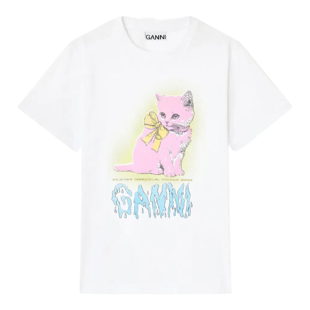600075441WHT0XS / T4339/00/151 - Basic cotton jersey construction - Neon pink kitten graphic with yellow bow - Blue dripping GANNI logo text - Classic crew neckline - Short sleeves - Relaxed fit GANNI Neon Kitty Tee delivers playful Scandinavian style with vibrant graphic artwork and signature Danish design sensibility. Crafted from soft basic cotton jersey in classic white, featuring a charming pink kitten illustration with yellow bow accent and blue dripping logo text. The relaxed fit and whimsical graphic make this an effortlessly cool statement piece for contemporary casual wear.