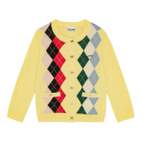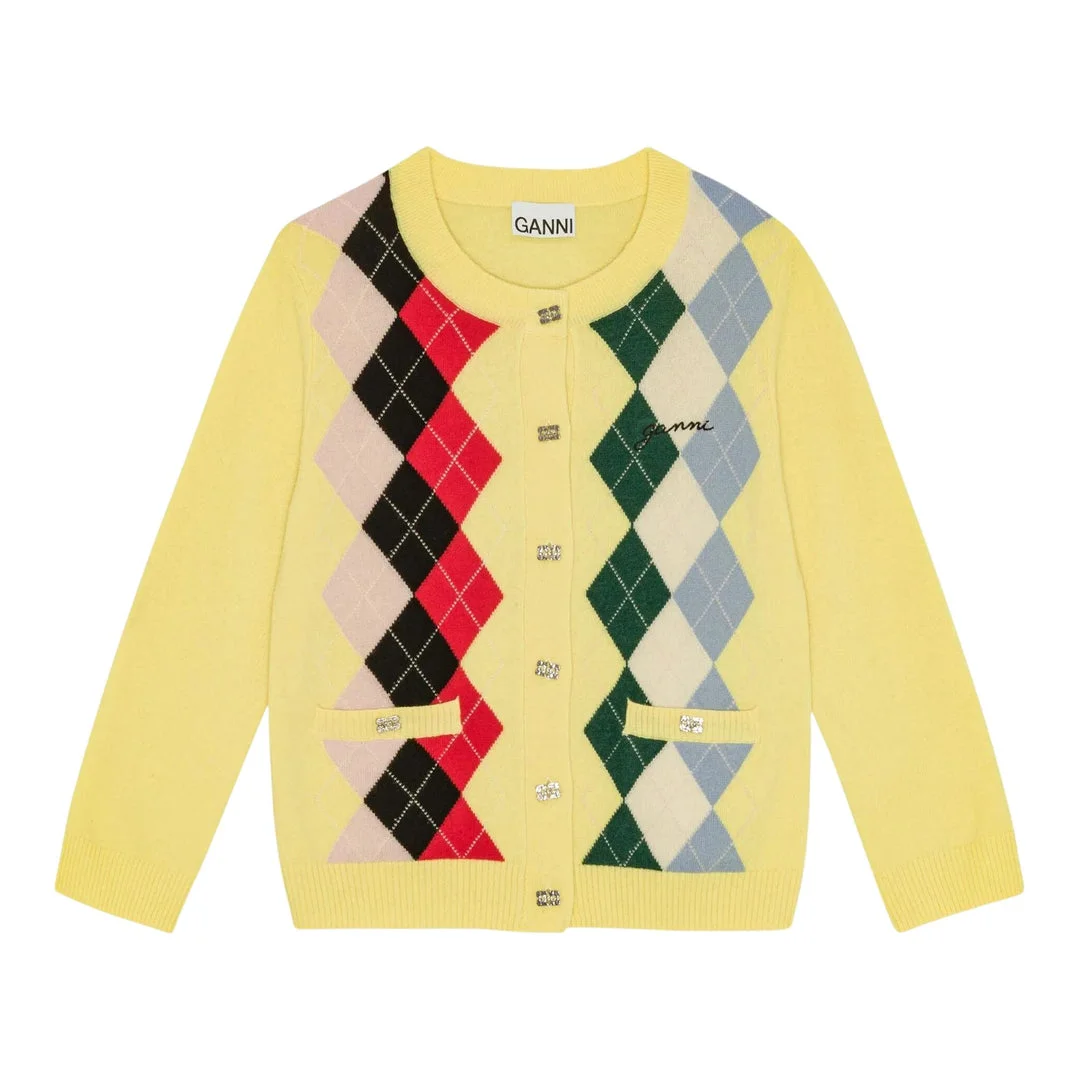 600070839YEL0XS / K2533/00/122 - Cashmere and wool blend construction - Button-front closure with crystal buttons - Multi-colored argyle pattern - Ribbed neckline, cuffs, and hem - Two front pockets - Relaxed fit GANNI Cashmere Wool Mix Cardigan delivers Scandinavian comfort with playful sophistication. Crafted from premium cashmere and wool blend in vibrant yellow, featuring a multi-colored argyle pattern with contrasting diamond motifs. The classic button-front silhouette and relaxed fit create a contemporary take on preppy-inspired knitwear.