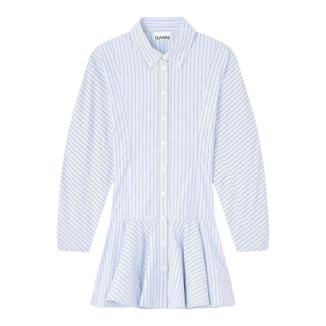 300049239LBL-34 / A5W1107/00/01M - Classic button-front closure - Pointed collar - Long sleeves with button cuffs - Relaxed oversized fit - Two front patch pockets - Premium cotton construction - Fine striped pattern The GANNI Check Cotton Oversized Shirt delivers contemporary Scandinavian style with relaxed sophistication and versatile wearability. Crafted from premium cotton in a subtle striped pattern featuring a crisp white base with fine blue pinstripes throughout. The oversized silhouette and button-front closure create an effortlessly modern piece perfect for layering or standalone styling.