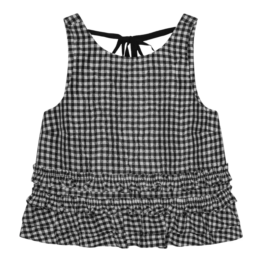600070868BLK034 / W0594/00/099 - Crinkled taffeta construction - Classic gingham check pattern - Open back with tie closure - Sleeveless design - Tiered ruffle hem - Relaxed fit The GANNI Crinkled Taffeta Check Open Back Top delivers contemporary femininity with playful architectural details. Crafted from lightweight crinkled taffeta in a classic gingham check pattern, featuring an open back design with tie closure and ruffle hem detailing. The sleeveless silhouette and textural fabric create a versatile piece that transitions effortlessly from casual to elevated styling.