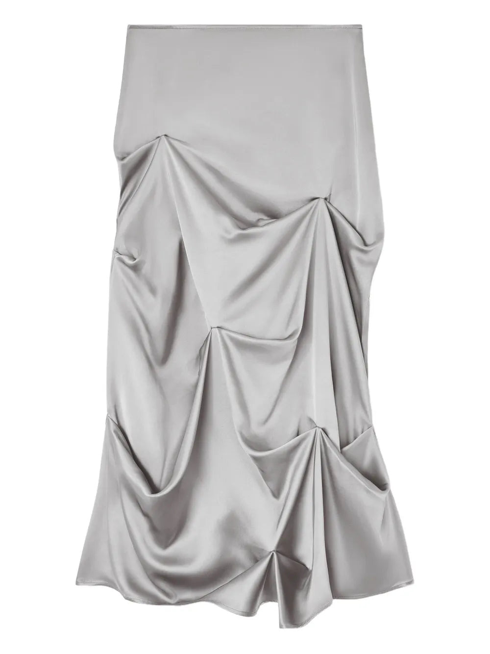 600075464GRY032 / W1006/00/039 - Double viscose satin construction - Strategic tuck detailing throughout - Sculptural draped silhouette - Midi length - Side zip closure - Relaxed fit through hips - Fully lined GANNI Double Viscose Satin Tuck Skirt delivers contemporary femininity with architectural draping and luxurious texture. Crafted from premium double viscose satin in sophisticated light gray, featuring strategic tuck detailing that creates dimensional volume and movement. The sculptural silhouette and fluid draping showcase GANNI's signature approach to modern Scandinavian design.