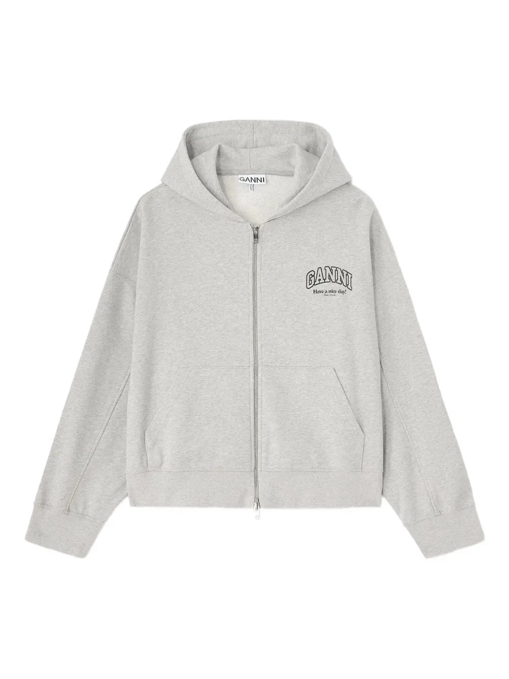 600077184GRY00L / A1060023/00/920 - Full zip front closure - Drawstring hood - Kangaroo front pocket - Ribbed cuffs and hem - Organic cotton construction - Relaxed fit - GANNI logo embroidery GANNI Essential Isoli Zip Hoodie delivers Scandinavian minimalism with sustainable comfort and versatile style. Crafted from premium organic cotton in soft heather gray, featuring a relaxed fit with full zip closure and kangaroo pocket. The brand's signature contemporary aesthetic and eco-conscious materials create an essential piece for modern casual wardrobes.
