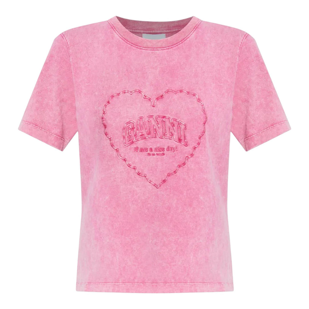 600075436DKP0XS / T4319/00/514 - Embroidered heart graphic with brand lettering - Heavy cotton construction - Vintage washed pink finish - Crew neckline - Short sleeves - Relaxed fit - Ribbed collar and cuffs GANNI Heavy Cotton Heart T-Shirt delivers contemporary Danish streetwear with playful graphic embroidery and vintage-inspired construction. Crafted from heavyweight cotton with a lived-in pink wash treatment, featuring embroidered heart motif with signature GANNI branding. The relaxed fit and vintage washed finish create an effortlessly cool aesthetic for everyday styling.
