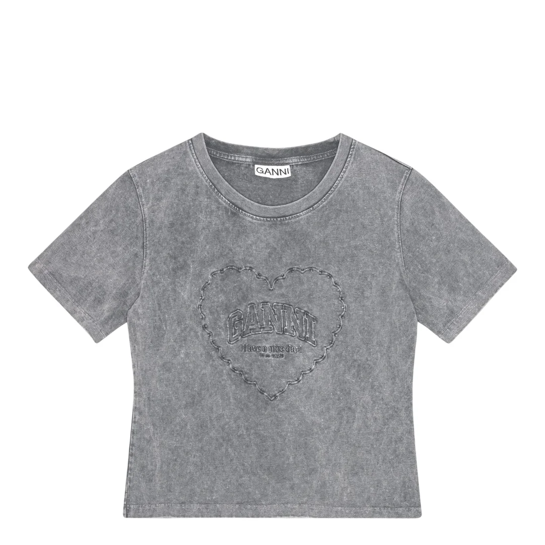 600070847GRY00M / T4254/00/252 - Heavy cotton jersey construction - Embroidered heart logo detail - Vintage washed finish - Cropped length - Short sleeves - Relaxed fit - Crew neckline GANNI Heavy Cotton Jersey Heart Cropped T-Shirt delivers Scandinavian cool with contemporary feminine details. Crafted from premium heavy cotton jersey in vintage-washed grey, featuring embroidered heart logo and relaxed cropped silhouette. The soft hand-feel and modern fit create an effortless statement piece for everyday styling.