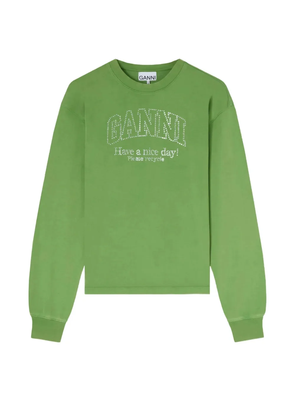 600083063GRN00L / A1050108/00/08J - Heavy organic cotton jersey construction - Rhinestone logo embellishment - Crew neckline - Long sleeves with ribbed cuffs - Relaxed fit - Ribbed hem GANNI Heavy Cotton Jersey Long Sleeve delivers sustainable comfort with the brand's signature playful aesthetic. Crafted from premium heavy-weight organic cotton in vibrant green, featuring rhinestone logo detailing and relaxed silhouette. The eco-conscious construction and contemporary Danish design create a perfect balance of comfort and style.