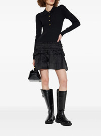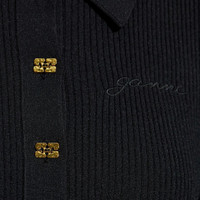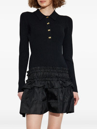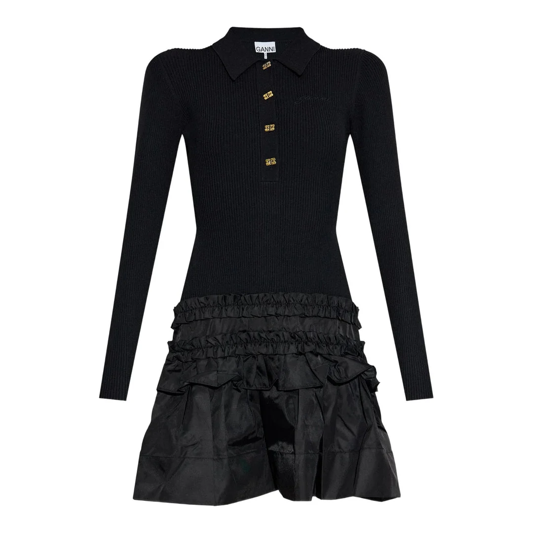 600070838BLK0XS / K2523/00/099 - Ribbed knit bodice with polo collar - Decorative gold-tone button details - Long fitted sleeves - Contrast taffeta ruffle skirt - Mini length silhouette - Fitted bodice with flared skirt GANNI Melange Rib Knit Mini Dress delivers contemporary Scandinavian style with modern feminine silhouette. Crafted from soft ribbed knit fabric in classic black, featuring a structured polo collar and decorative gold-tone buttons at the chest. The contrast taffeta ruffle skirt adds dynamic texture and movement to create GANNI's signature playful-meets-sophisticated aesthetic.
