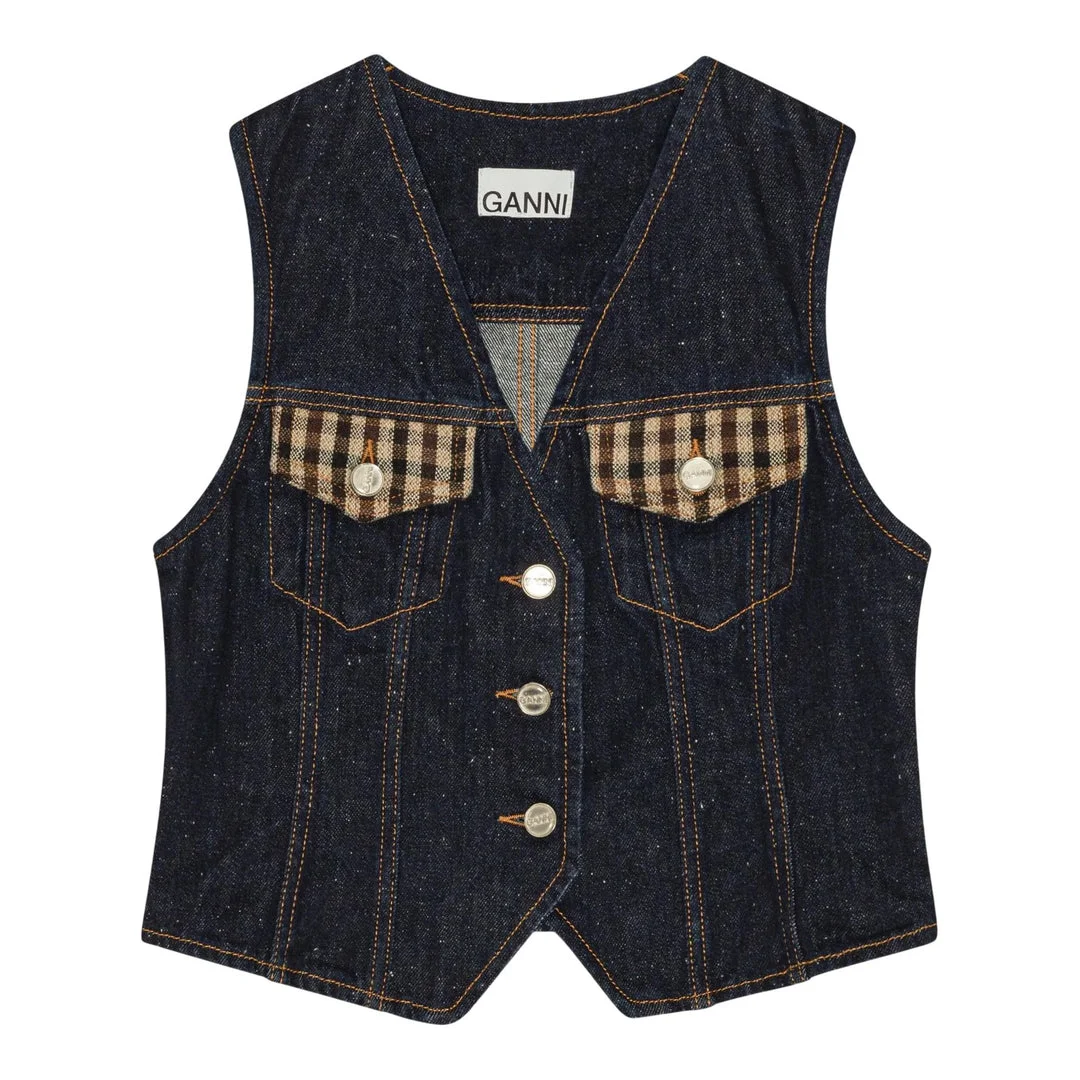 600070825DNM034 / J1764/00/568 - Button-front closure with contrast buttons - Dual chest pockets with striped detailing - Orange contrast topstitching throughout - Sleeveless design for layering - Neppy denim construction - Classic vest silhouette - V-neckline GANNI Neppy Denim Vest delivers contemporary Scandinavian style with sustainable denim construction and versatile layering potential. Crafted from premium neppy denim featuring contrast striped chest pockets and classic button-front closure with orange topstitching throughout. The sleeveless design and structured fit create a modern wardrobe staple perfect for year-round styling.