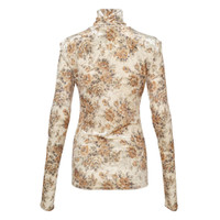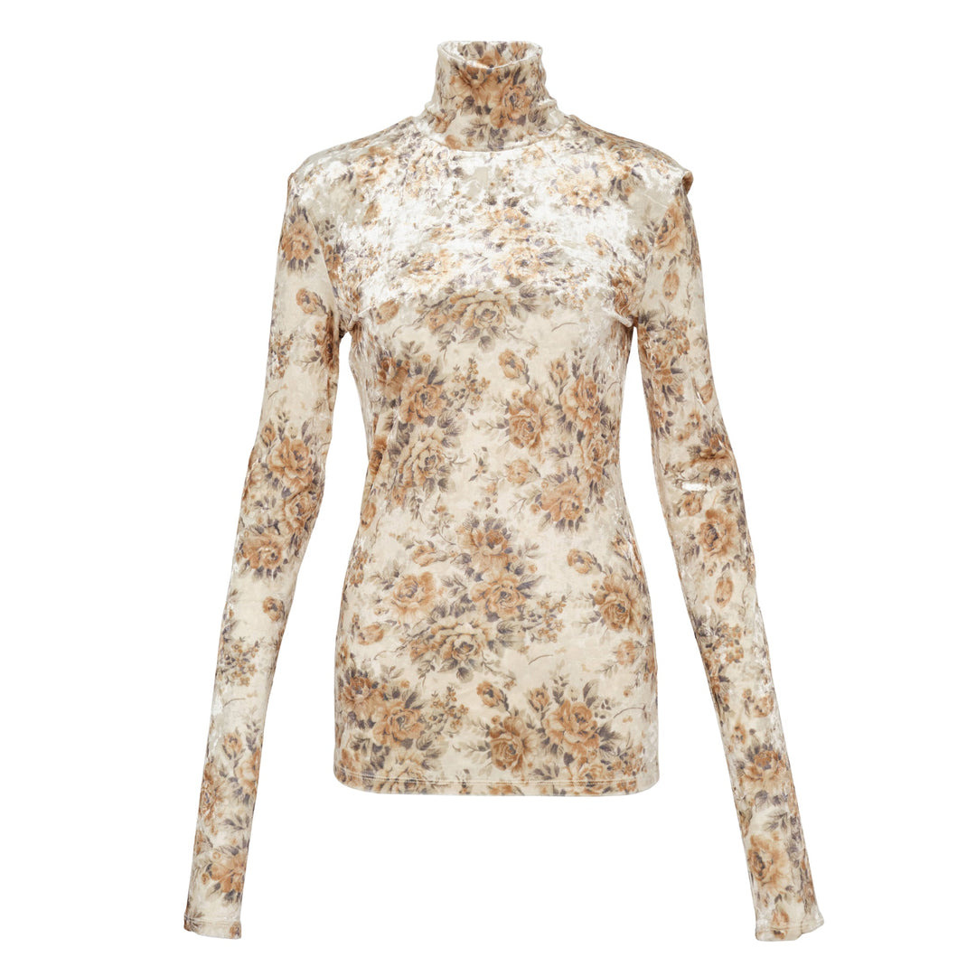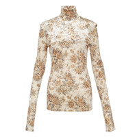 600075443PRT034 / T4356/00/054 - High turtleneck collar - Long sleeves with fitted cuffs - Vintage floral print throughout - Stretch velour jersey construction - Slim fitted silhouette - Cream base with brown floral motifs GANNI Printed Velour Jersey Turtleneck delivers luxurious comfort with romantic floral aesthetics and premium tactile appeal. Crafted from soft velour jersey in cream with vintage-inspired floral print in warm brown and beige tones, featuring a fitted silhouette and high turtleneck collar. The stretch construction and signature GANNI feminine design create an elegant layering piece for contemporary wardrobes.