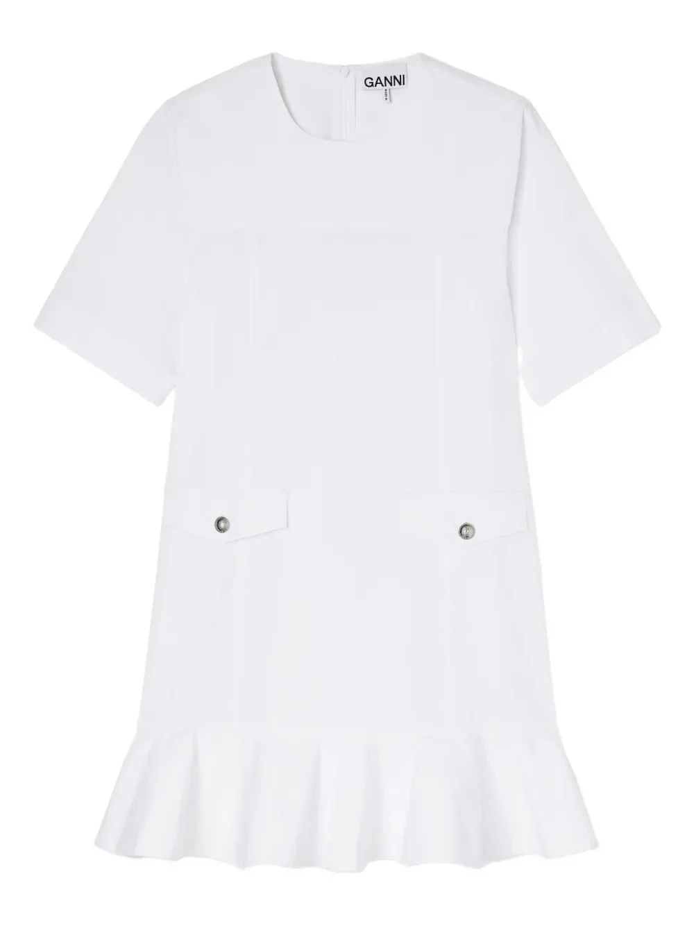600077162WHT032 / A1030205/00/151 - V-neckline - Short sleeves - Functional flap pockets with button closure - Flounced hem detail - Stretch cotton construction - Relaxed fit - Mini length GANNI Stretch Cotton Mini Dress delivers effortless Scandinavian style with contemporary femininity and comfortable stretch construction. Crafted from premium stretch cotton in crisp white, featuring functional flap pockets and a flattering flounced hem detail. The relaxed silhouette and signature GANNI aesthetic create versatile wardrobe essential for modern dressing.