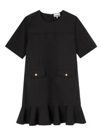 600077162BLK032 / A1030205/00/099 - Round neckline - Short sleeves - Back zip closure - Front flap pockets with gold buttons - Ruffle hem detail - Stretch cotton construction - Mini length - Regular fit GANNI Stretch Cotton Mini Dress delivers contemporary Scandinavian style with flattering silhouette and effortless wearability. Crafted from premium stretch cotton in classic black, featuring flap pocket details with gold-tone hardware and feminine ruffle hem. The comfortable fit and versatile design make it perfect for both day and evening occasions.