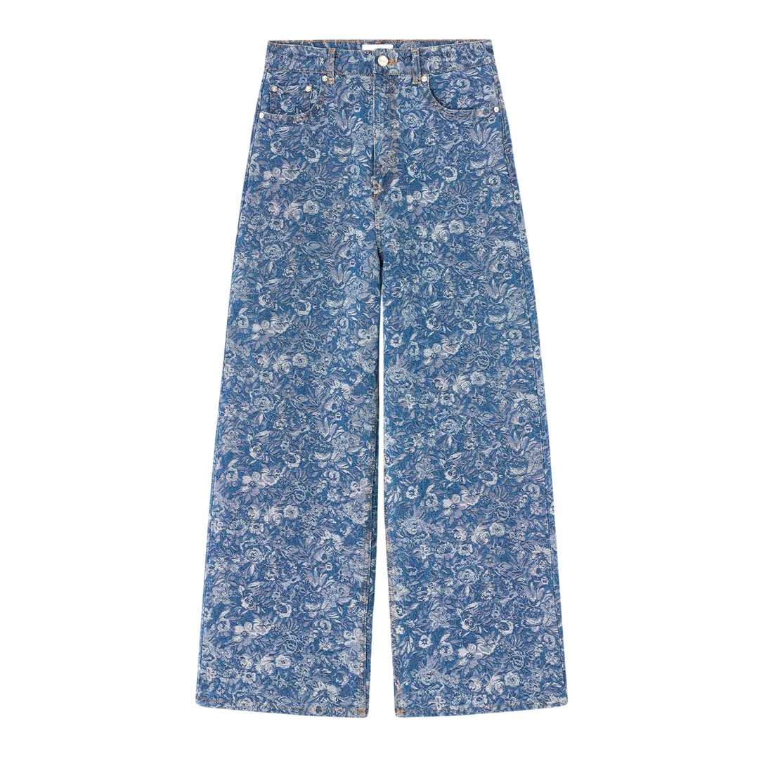 600075417BLU025 / J1871/00/566 - All-over blue paisley tapestry print - High-rise waistband - Wide-leg baggy fit - Front button and zip closure - Classic five-pocket styling - Premium cotton denim construction - Full-length inseam GANNI Tapestry Denim Baggy Jeans deliver statement style with relaxed comfort and vintage-inspired prints. Crafted from premium cotton denim featuring an all-over blue paisley tapestry pattern, offering a contemporary twist on classic wide-leg silhouettes. The oversized fit and artistic print design create a bold wardrobe statement that embodies GANNI's playful Scandinavian aesthetic.