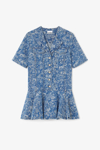 300049923DBL-32 / A5J1870/00/566 - Button-front closure with contrast buttons - Short sleeves with relaxed fit - Flared mini dress silhouette - Botanical tapestry print throughout - Premium denim construction - Collar detail GANNI Tapestry Denim Mini Dress delivers contemporary Scandinavian style with intricate artisanal detailing. Crafted from premium denim in blue tapestry print, featuring button-front closure and feminine flared silhouette. The brand's signature playful aesthetic and vintage-inspired botanical motifs create a statement piece for modern wardrobes.