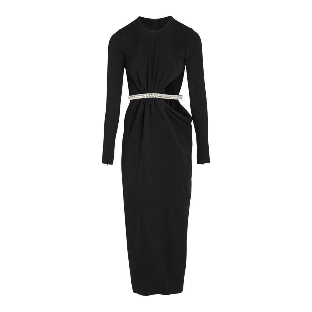 300043706BLK-40 / A424FWSVTE5049-A6JOK/00/9999 - High mock neckline - Long sleeves - Strategic waist cutout with crystal belt detail - Twisted front draping - Form-fitting midi silhouette - Stretch jersey construction - Back zip closure - Lined bodice Giambattista Valli Cutout Midi Dress delivers sophisticated Italian couture with dramatic architectural details and refined elegance. Crafted from luxurious stretch jersey in classic black, featuring strategic cutout detailing at the waist with crystal embellishment and twisted front draping. The form-fitting silhouette and signature Valli construction create a striking statement piece for elevated occasions.