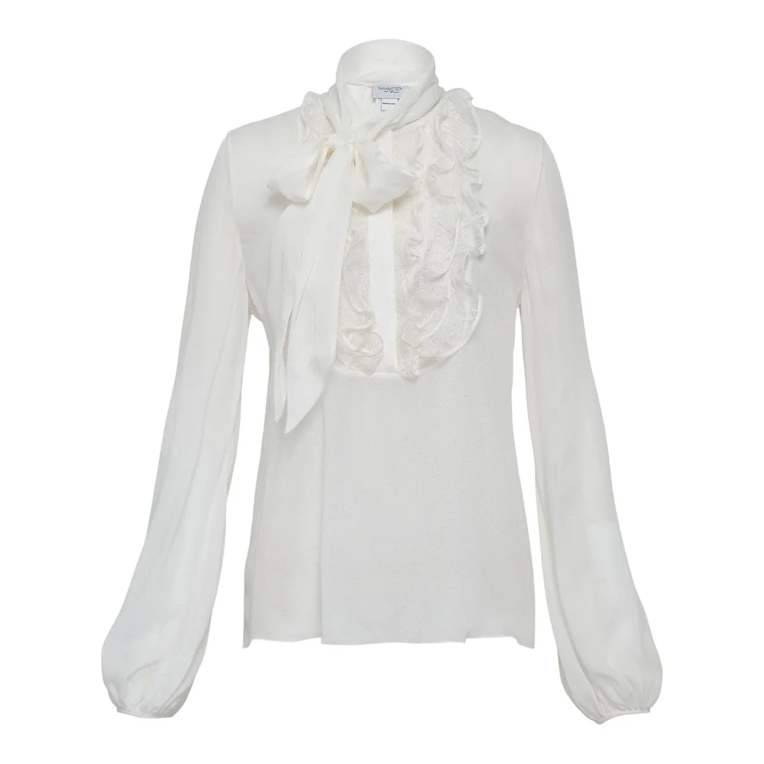 600072741OWT042 / 25FWPVCL1105-59SAB/00/1101 - Silk construction in ivory - Ruffled mock neck collar - Bow tie closure at neckline - Long sleeves with fitted cuffs - Flowing feminine silhouette - French seam construction The Giambattista Valli Sable Blouse delivers romantic French couture with feminine elegance and luxurious detailing. Crafted from premium ivory silk with intricate ruffled neckline and delicate bow tie closure, featuring the brand's signature romantic aesthetic. The flowing silhouette and refined construction create a sophisticated statement piece for special occasions.