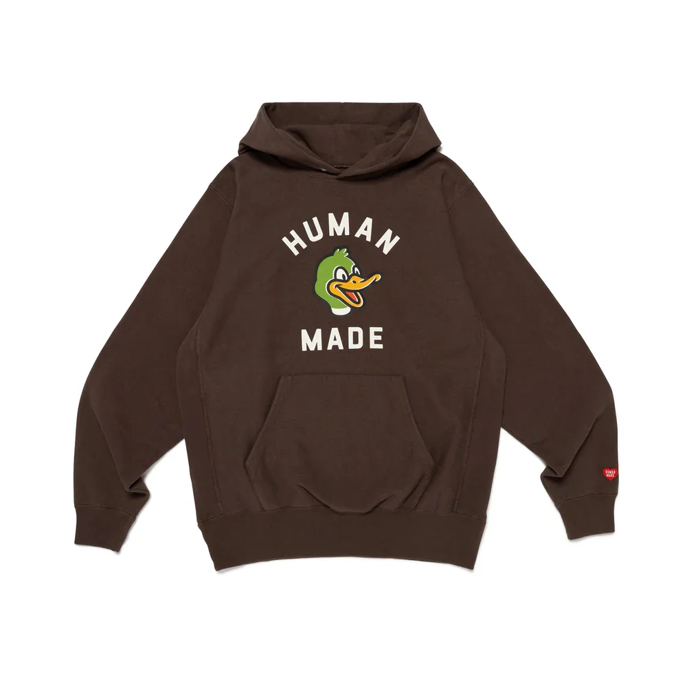 300051474BRN-SS / S6HM31CS036/JAN/BROWN - Heavyweight cotton fleece construction - Signature duck mascot graphic - Bold 'HUMAN MADE' chest lettering - Adjustable drawstring hood - Kangaroo front pocket - Ribbed cuffs and hem - Oversized relaxed fit - Red brand label detail The Human Made Heavyweight Hoodie delivers premium Japanese streetwear with signature duck mascot branding and superior construction. Crafted from heavyweight cotton fleece in rich brown, featuring the iconic cartoon duck graphic and bold 'HUMAN MADE' lettering across the chest. The oversized fit and premium weight create a statement piece that embodies Nigo's playful yet refined aesthetic.