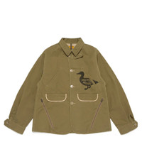 600065962KHA0XL / HM29JK023/00/OLIVE DRAB - Button-front closure with cream buttons - Multiple chest and waist pockets - Contrast cream piping trim - Adjustable cuff tabs with snap closures - Human Made duck logo embroidery - Point collar design - Relaxed fit Human Made Hunting Jacket delivers vintage-inspired streetwear with Japanese craftsmanship and military heritage design. Constructed from durable olive cotton twill with contrast cream piping details and functional multi-pocket configuration. The signature duck emblem and structured silhouette create an authentic workwear aesthetic with contemporary street appeal.