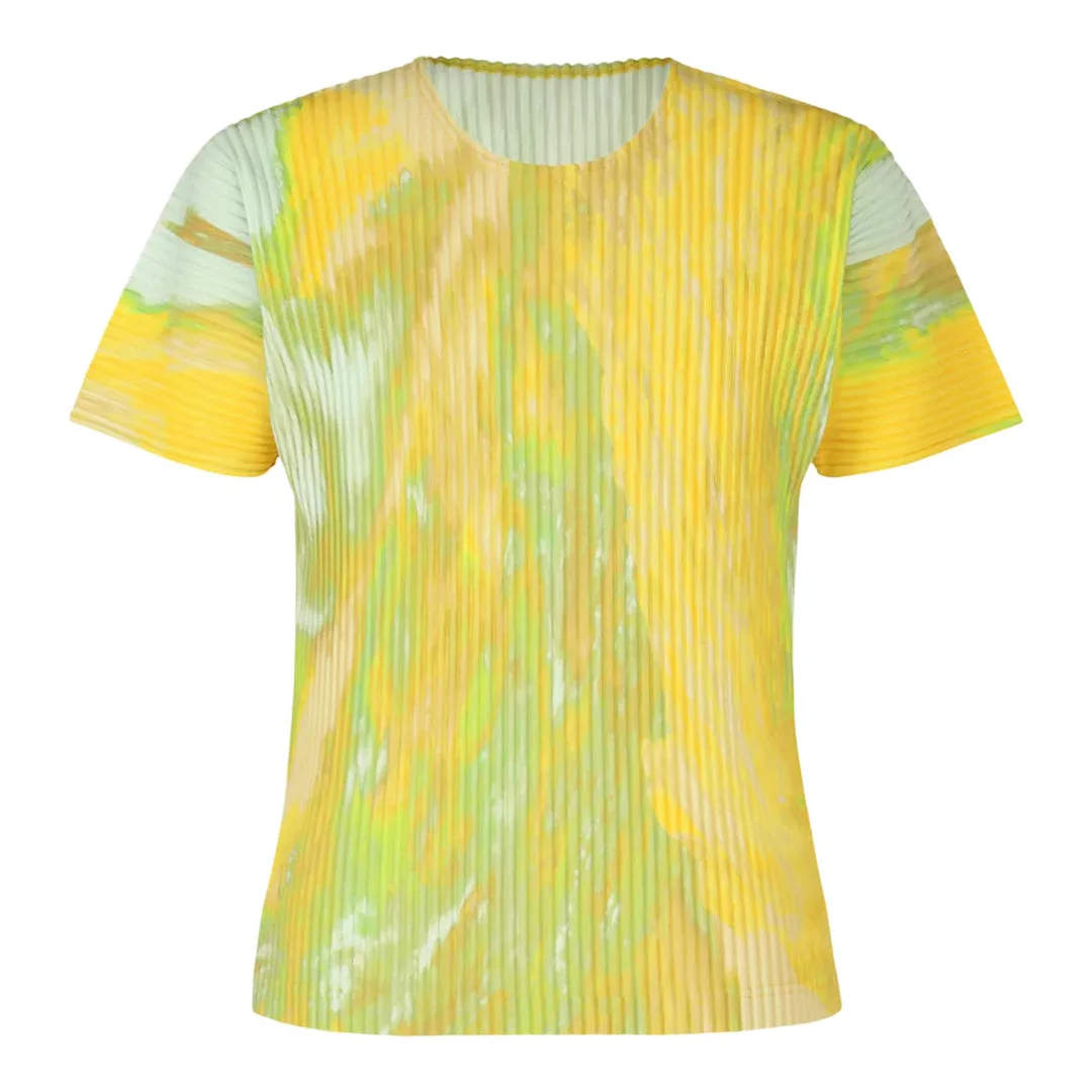 300048447YEL-03 / A5HP58JK206/00/52/JUL - Signature pleated polyester construction - Round neckline - Short sleeves - Agate mineral-inspired pattern - Wrinkle-resistant and packable - Relaxed fit - Machine washable HOMME PLISSE ISSEY MIYAKE Agate T-Shirt delivers innovative pleated construction with contemporary artistic expression. Crafted from the brand's signature pleated polyester in vibrant yellow and green agate-inspired patterns, featuring the iconic technical pleating process. The lightweight, wrinkle-resistant fabric and mineral-inspired colorway create a striking statement piece that embodies the brand's fusion of technology and nature.