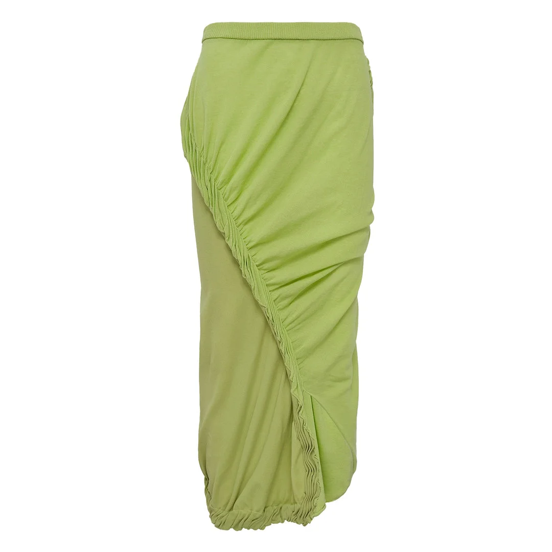 600061900GRN002 / IM56KG814/00/60/APR - Elastic waistband for comfort - Asymmetrical ruched side detailing - Gathered elastic hem - Technical stretch fabric construction - Mid-length silhouette - Signature ISSEY MIYAKE draping ISSEY MIYAKE Beanstalk Skirt delivers innovative Japanese design with architectural draping and contemporary silhouette. Crafted from technical stretch fabric in fresh lime green, featuring signature ruched detailing along the side seam. The elastic waistband and gathered hem create dynamic movement while maintaining the brand's distinctive pleating aesthetic.