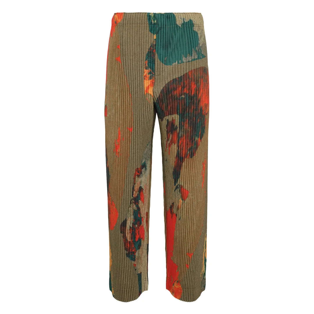 600069326GRN001 / HP58JF213/00/62/DEC - Signature pleated fabric construction - Abstract painted stone motif pattern - Elasticated waistband - Relaxed straight leg silhouette - Wrinkle-resistant pleated material - Lightweight and packable design HOMME PLISSE ISSEY MIYAKE Painted Stone Pants deliver innovative pleated construction with artistic brushstroke patterns in vibrant color palette. Crafted from signature lightweight pleated fabric featuring abstract painted motifs in teal, orange, and olive tones throughout. The brand's revolutionary pleating technology creates wrinkle-resistant garments that maintain their sculptural shape while offering exceptional comfort.