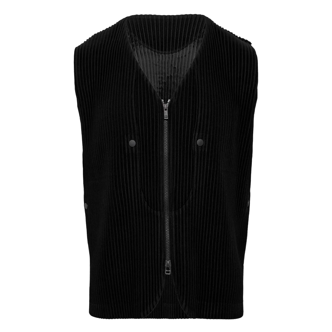600069319BLK002 / HP58JE301/00/15/NOV - Signature permanent pleating technology - Full-zip front closure - Stand collar design - Two chest patch pockets - Sleeveless construction - Lightweight pleated fabric - Machine washable - Regular fit HOMME PLISSE ISSEY MIYAKE Quarry Vest delivers innovative pleated design with contemporary minimalism and effortless sophistication. Crafted from the brand's signature lightweight pleated fabric in versatile black, featuring precise vertical ribbing and streamlined silhouette. The permanent pleating technology and sleeveless construction create a modern layering piece that maintains its structure while offering freedom of movement.