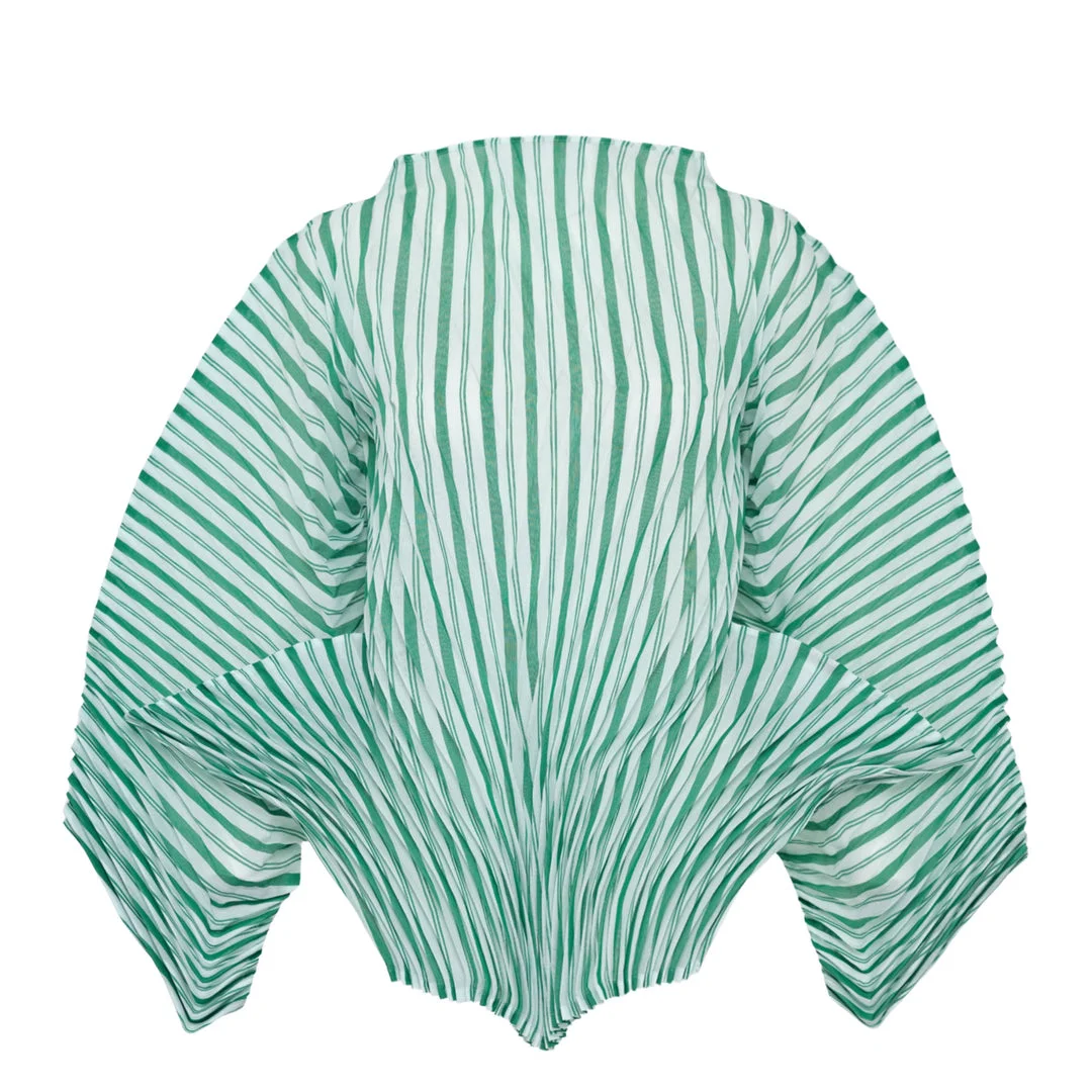 600069590GRN002 / IM58FJ156/00/66/DEC - Hand-pleated construction - Green and white striped pattern - Kimono-style wide sleeves - Mock neck collar - Permanent pleating technology - Lightweight structured fabric - Relaxed cropped fit - Machine washable pleats ISSEY MIYAKE Striped Hand Pleats Top delivers innovative pleating technology with architectural precision and contemporary sophistication. Crafted from lightweight pleated fabric in fresh green and white stripes, featuring the brand's signature hand-pleating technique for structured movement. The kimono-inspired silhouette and permanent pleats create a sculptural statement piece that maintains its shape wear after wear.