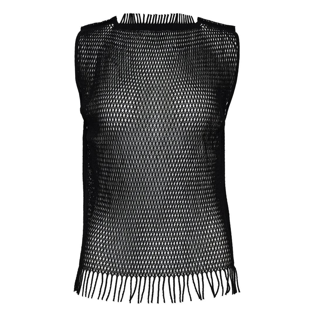 600061909BLK002 / IM56KK851/00/15/MAR - Engineered mesh construction - Sleeveless design - Fringe hem detailing - Open-weave texture - Crew neckline - Regular fit The ISSEY MIYAKE Washi AP Sweater delivers innovative textile technology with the brand's signature pleating expertise. Crafted from engineered mesh construction in classic black, featuring an open-weave structure that creates dimensional texture and breathability. The sleeveless silhouette with fringe detailing showcases ISSEY MIYAKE's avant-garde approach to contemporary knitwear.