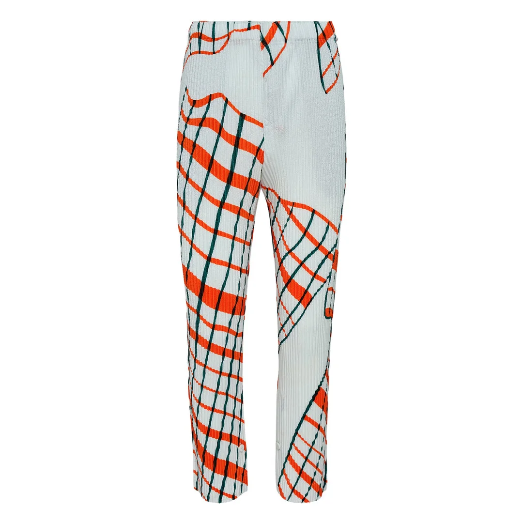 600061302WHT001 / HP56JF377/00/01/APR - Signature heat-pressed pleating technology - Elasticated waistband - Relaxed straight-leg fit - Windswept geometric plaid pattern - Technical pleated fabric construction - Machine washable and wrinkle-resistant - Full-length inseam HOMME PLISSE ISSEY MIYAKE Windswept Plaid Pants deliver avant-garde design with the brand's signature pleating technology and geometric pattern innovation. Crafted from technical pleated fabric in light gray base with bold orange and teal plaid design, featuring heat-pressed pleats that maintain their structure and shape. The dynamic windswept plaid pattern creates visual movement while showcasing ISSEY MIYAKE's mastery of textile engineering and contemporary Japanese design.
