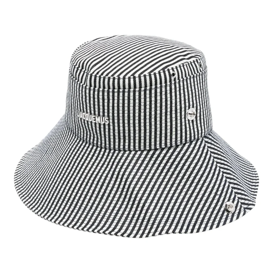 600074321STR056 / AW25-ACU00721AD00046/00/3FU - Classic bucket hat silhouette - Black and white striped cotton construction - Embroidered JACQUEMUS logo - Silver-tone metal eyelets - Structured crown and brim - Medium brim width The JACQUEMUS Le Bob De-Nimes delivers French luxury with contemporary bucket hat styling and premium construction. Crafted from structured cotton with distinctive black and white striped pattern, featuring the brand's signature minimalist aesthetic and clean finishing. The classic bucket silhouette and iconic JACQUEMUS branding create a sophisticated accessory for modern wardrobes.