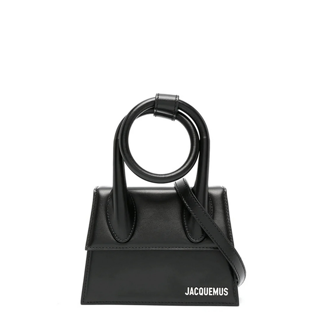 JACQUEMUS Le Chiquito Noeud Renowned for its boundary-pushing designs, JACQUEMUS introduces the iconic Le Chiquito Noeud with a distinctive coiled top handle that can be wrapped and snapped closed. The front showcases the brand's signature logo lettering, embodying a compact yet statement-making design. - 100% Calf Leather - Width 18 cm / Height 14 cm / Depth 7 cm / Handle 10 cm / Strap 52 cm - Black - Rolled top handle - Foldover top with magnetic fastening - Adjustable detachable shoulder strap - Logo plaque - Internal slip pocket - Internal logo patch - Fully lined - Silver-tone hardware - Main compartment