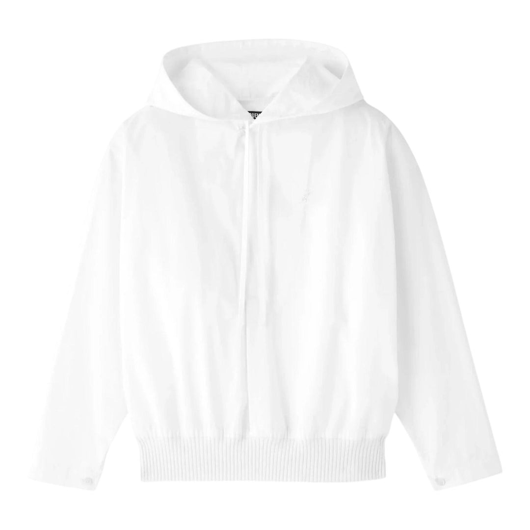 300049512WHT-34 / A525HTOW00830AW00648/00/100 - Front zip closure - Hooded design - Ribbed hem and cuffs - Long sleeves - Cotton blend construction - Relaxed fit - JACQUEMUS signature styling JACQUEMUS Le Haut Trapezi delivers contemporary French minimalism with architectural silhouette and modern sophistication. Crafted from premium cotton blend fabric in crisp white, featuring the brand's signature clean lines and sculptural construction. The structured design and timeless aesthetic create an elevated wardrobe essential with Provencal-inspired craftsmanship.