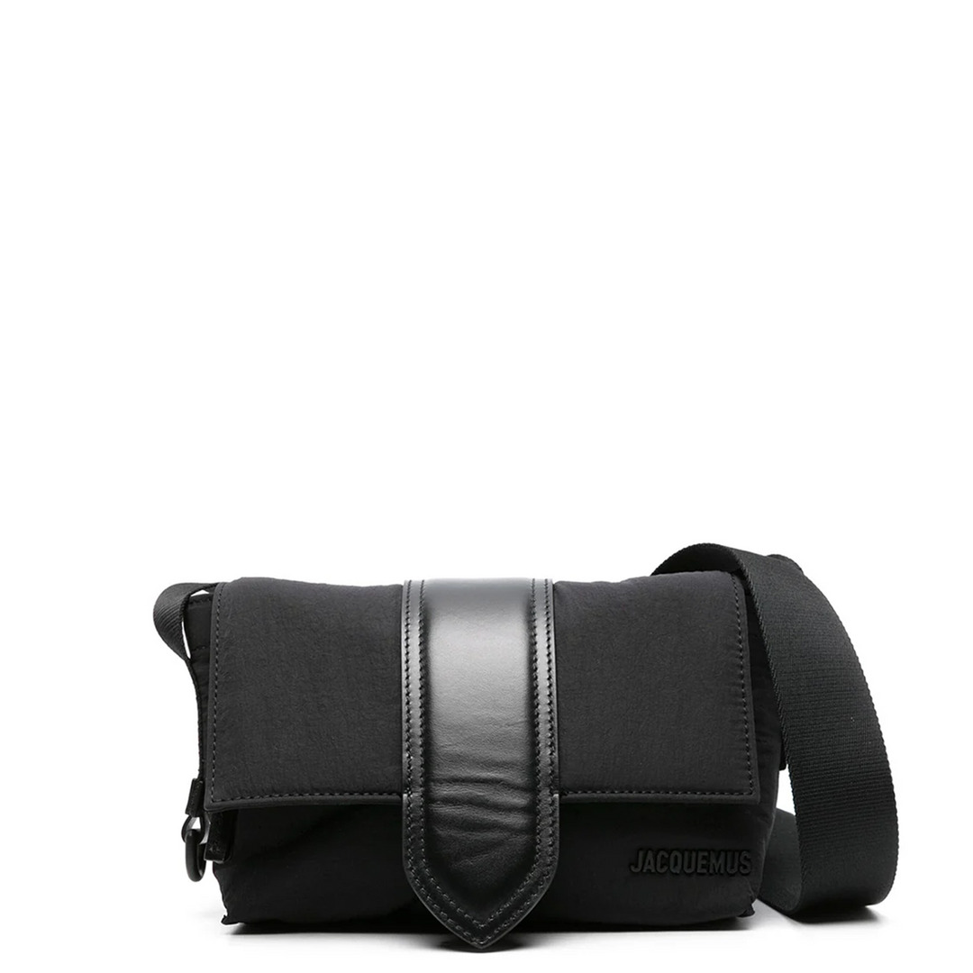 JACQUEMUS Le petit messenger Bambino - Composition: Lining:100%Cotton, Outer: 100% Nylon & 100% Leather - Dimension: Width about 9.50cm/ Height about 14.5cm / Length about 22.0cm - Black - Soft nylon messenger bag - Leather details - Top handle - Magnetic flap tab closure - Adjustable cross-body strap - Back patch pocket - Embossed logo - Matte black hardware - Zipped interior closure - Interior patch pocket - Fully lined in cotton