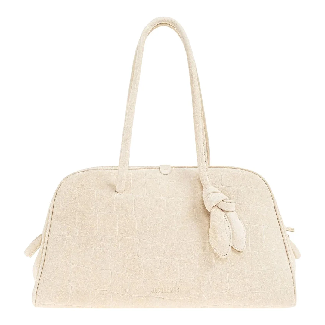 600074324WHT0OS / AW25-BAU00417AC07A09/00/120 - Embossed geometric pattern leather - Dual top handles - Zip-around closure - Structured silhouette - Signature knotted leather charm - Interior compartment - Gold-tone hardware accents JACQUEMUS Le Turismo Handbag delivers effortless French elegance with structured sophistication and versatile functionality. Crafted from premium embossed leather in warm cream tone, featuring the signature geometric pattern and clean architectural lines. The thoughtful proportions and refined hardware create a timeless accessory perfect for modern lifestyles.