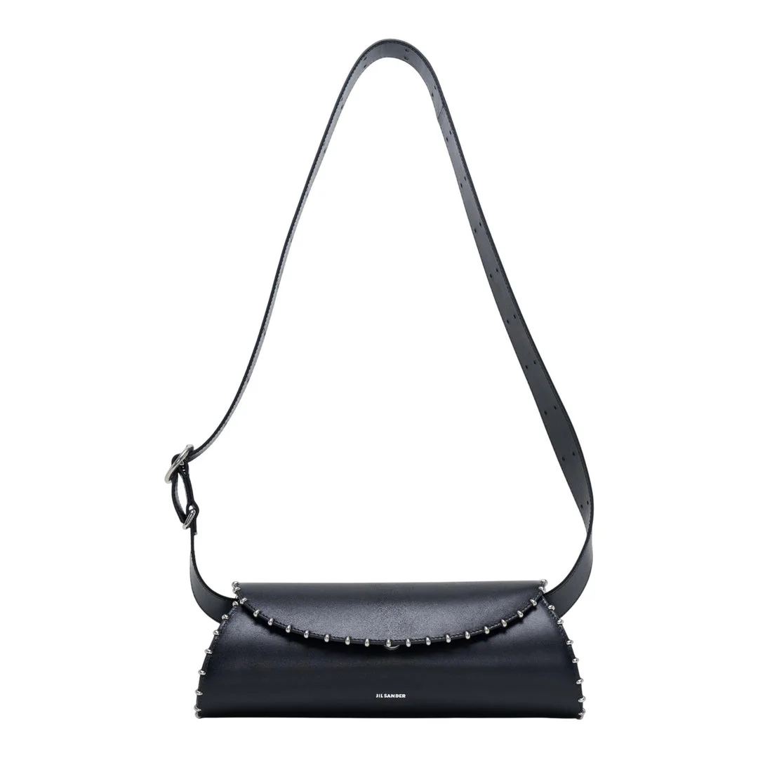 600073259BLK0OS / J07WD0023/P8803/001 - Premium leather construction - Adjustable shoulder strap - Studded edge detailing - Magnetic flap closure - Interior compartment organization - Structured curved silhouette - Silver-tone hardware The Jil Sander Cannolo Shoulder Bag Small delivers minimalist luxury with architectural precision and understated elegance. Crafted from premium leather in sophisticated navy blue, featuring the brand's signature clean lines and studded detailing along the curved edges. The structured silhouette and adjustable shoulder strap create a versatile piece that embodies Jil Sander's refined aesthetic.