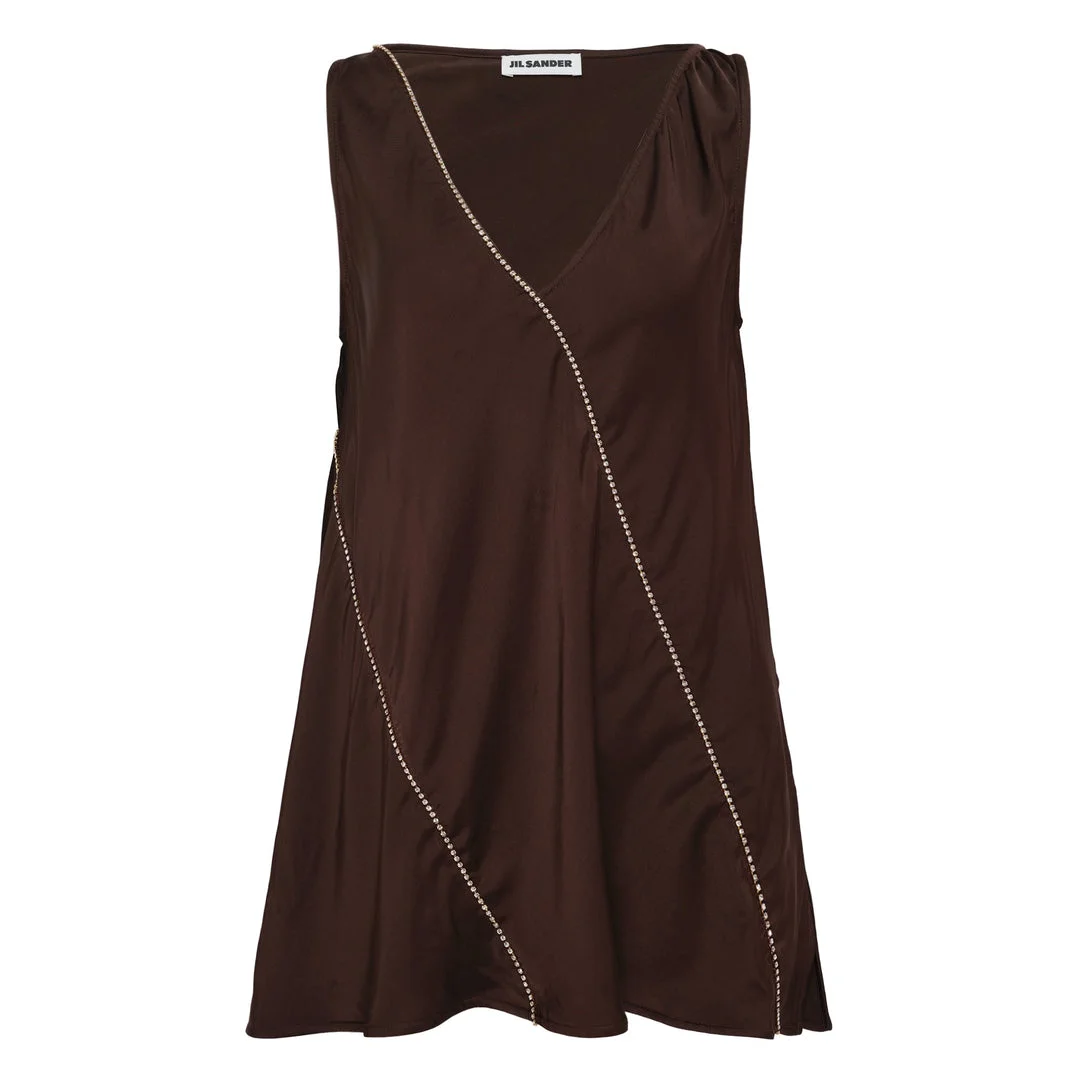 600077935BUR034 / J01NC0176/J65022/602 - Diagonal metallic chain detailing - Sleeveless design with wide armholes - Asymmetrical hemline - V-neckline - Sustainable fabric construction - Relaxed flowing fit - Draped silhouette Jil Sander Chain Detail Tank Top delivers minimalist luxury with sustainable craftsmanship and contemporary edge. Crafted from eco-friendly fabric in rich chocolate brown, featuring metallic chain trim that creates striking diagonal lines across the silhouette. The flowing construction and signature clean aesthetic elevate wardrobe essentials with architectural detail.