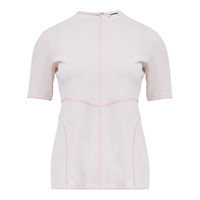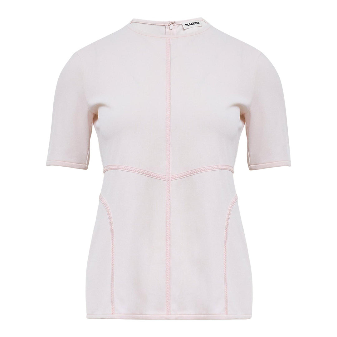 600073156PNK034 / PF25-J01NF0004/J65016/688-CRU - Fluid viscose crepe construction - Short sleeves with clean finish - Classic crewneck silhouette - Back zip closure - Fitted bodice with structured seaming - Minimalist design aesthetic Jil Sander Crepe Fluid Viscose Short Sleeve Crewneck Top delivers minimalist sophistication with refined draping and clean architectural lines. Crafted from premium fluid viscose crepe in soft lavender, featuring the brand's signature precise tailoring and seamless construction details. The structured yet fluid silhouette embodies Jil Sander's mastery of understated luxury and contemporary femininity.