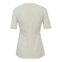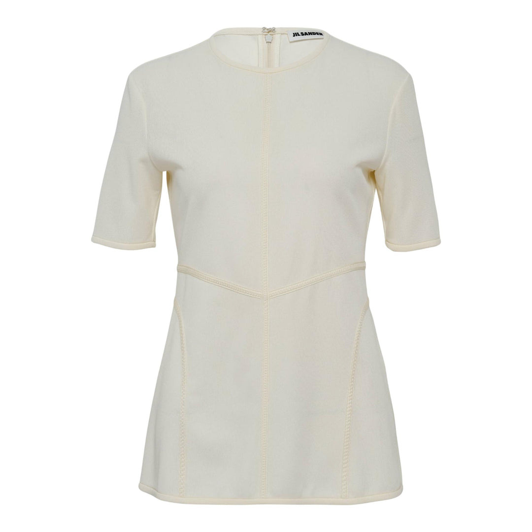 600073156BGE034 / PF25-J01NF0004/J65016/105-CRU - Fluid viscose crepe construction - Mock neck design - Short sleeves - Back zip closure - Seamed waist detail - Fitted silhouette Jil Sander Crepe Fluid Viscose Top delivers minimalist elegance with modern sophistication and clean tailoring. Crafted from premium fluid viscose crepe in crisp off-white, featuring the brand's signature architectural construction with subtle seam detailing. The structured silhouette and refined drape create an effortless foundation piece for contemporary wardrobes.