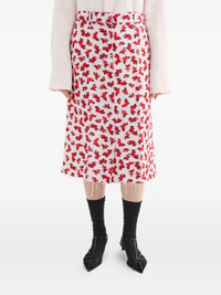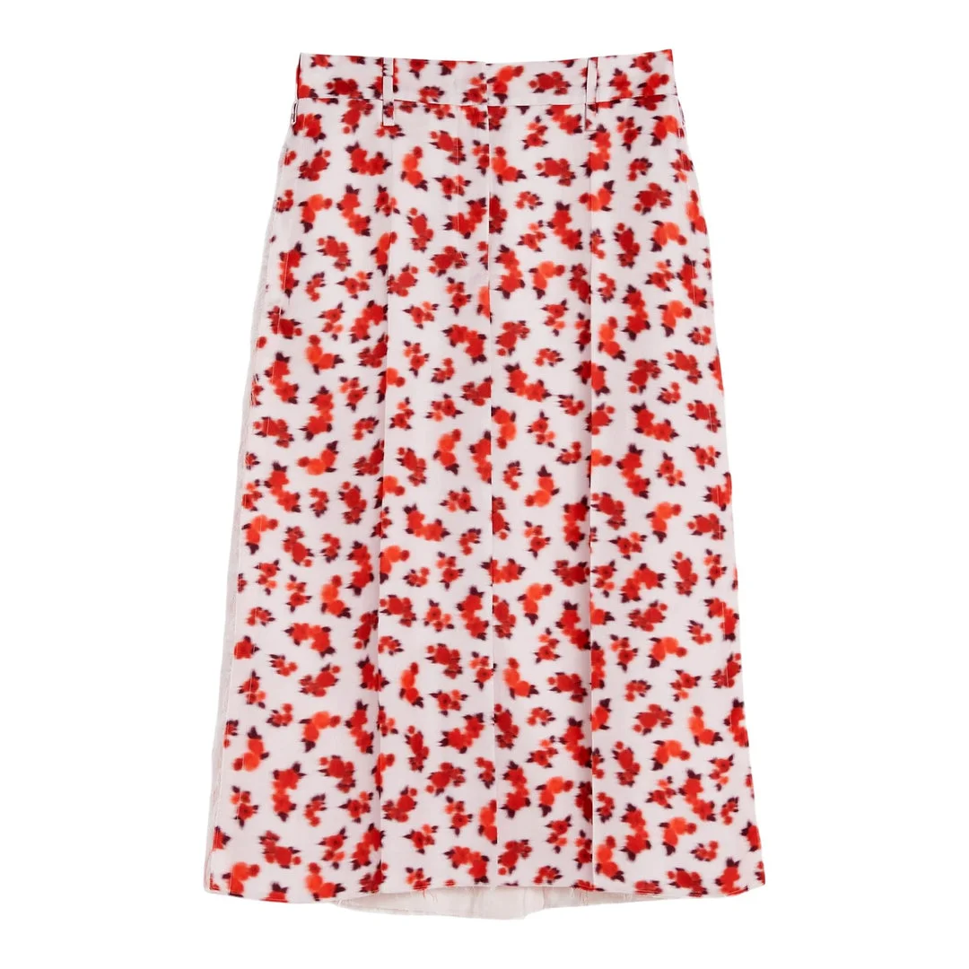 600073177RED036 / PF25-J02MA0332/J65333/690-CRU - Midi-length silhouette - High-waisted fit - Fluid viscose fabric construction - Autumn leaf print pattern - Side zip closure - Unlined for breathability - A-line cut for comfortable movement The Jil Sander Fluid Viscose Printed Skirt delivers effortless elegance with minimalist luxury craftsmanship. Made from premium viscose fabric featuring a delicate autumn leaf print in vibrant red tones against a white base, creating fluid movement with every step. The midi-length silhouette and signature clean tailoring exemplify the brand's understated sophistication.
