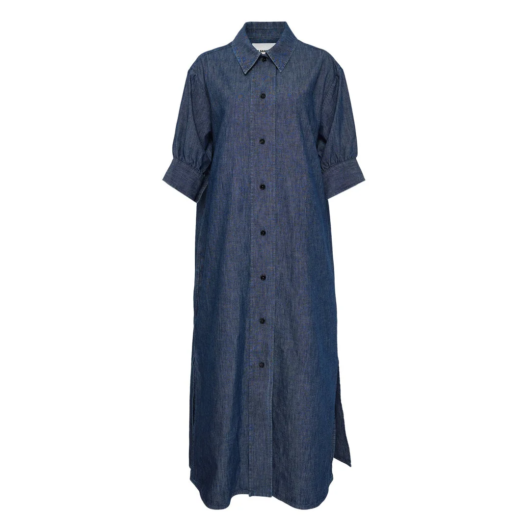 600077944DNM034 / J02CT0600/J45323/406 - Point collar with button-down closure - Three-quarter sleeves with gathered cuffs - Full-length button placket - Side seam slits - Lightweight cotton chambray construction - Relaxed fit through body - Midi length The Jil Sander Light Cotton Chambray Dress delivers minimalist sophistication with relaxed tailoring and contemporary design. Crafted from premium lightweight cotton chambray in classic indigo blue, featuring a structured shirt collar and three-quarter gathered sleeves. The midi-length silhouette and signature clean aesthetic create effortless elegance for modern wardrobes.