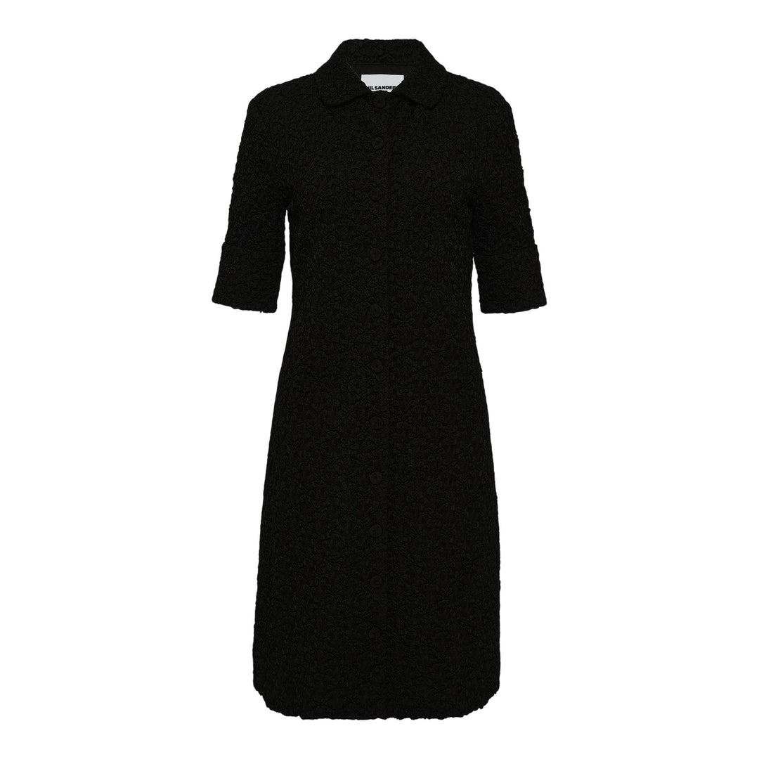 600073138BLK034 / PF25-J01CT0249/J20298/001-CRU - Classic shirt collar - Three-quarter length sleeves - Button-front closure - Textured viscose fabric - Above-knee length - Relaxed fit - Side seam details The Jil Sander Short Shirt Dress delivers minimalist sophistication with contemporary tailoring and refined feminine silhouette. Crafted from premium viscose with subtle textural detailing in elegant black, featuring the brand's signature clean lines and architectural construction. The shirt-style design with three-quarter sleeves creates a versatile piece that transitions effortlessly from day to evening wear.